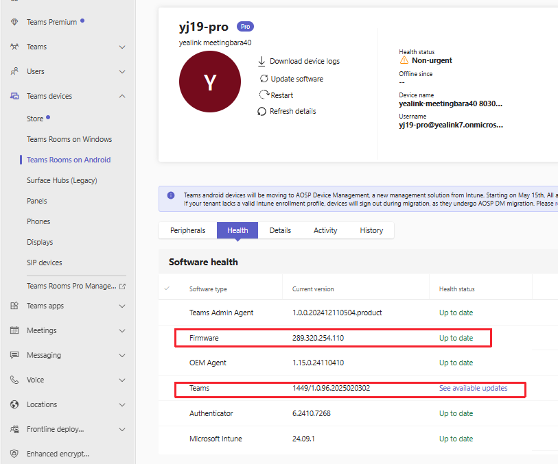 For Teams Room on Android, the Teams App and Teams Admin Agent are included with the system firmware. Microsoft releases updates to these apps in the Teams Admin Centre. Currently, these apps need to be updated manually.