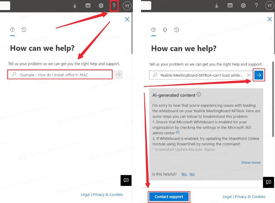 3.Review the suggested topics. If the results aren't helpful, select Contact support.